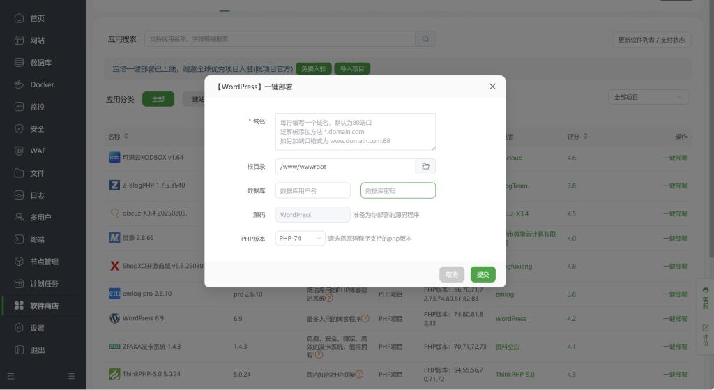 PHP版本选择与网站程序相匹配的版本WordPressPHP7.4/8.0